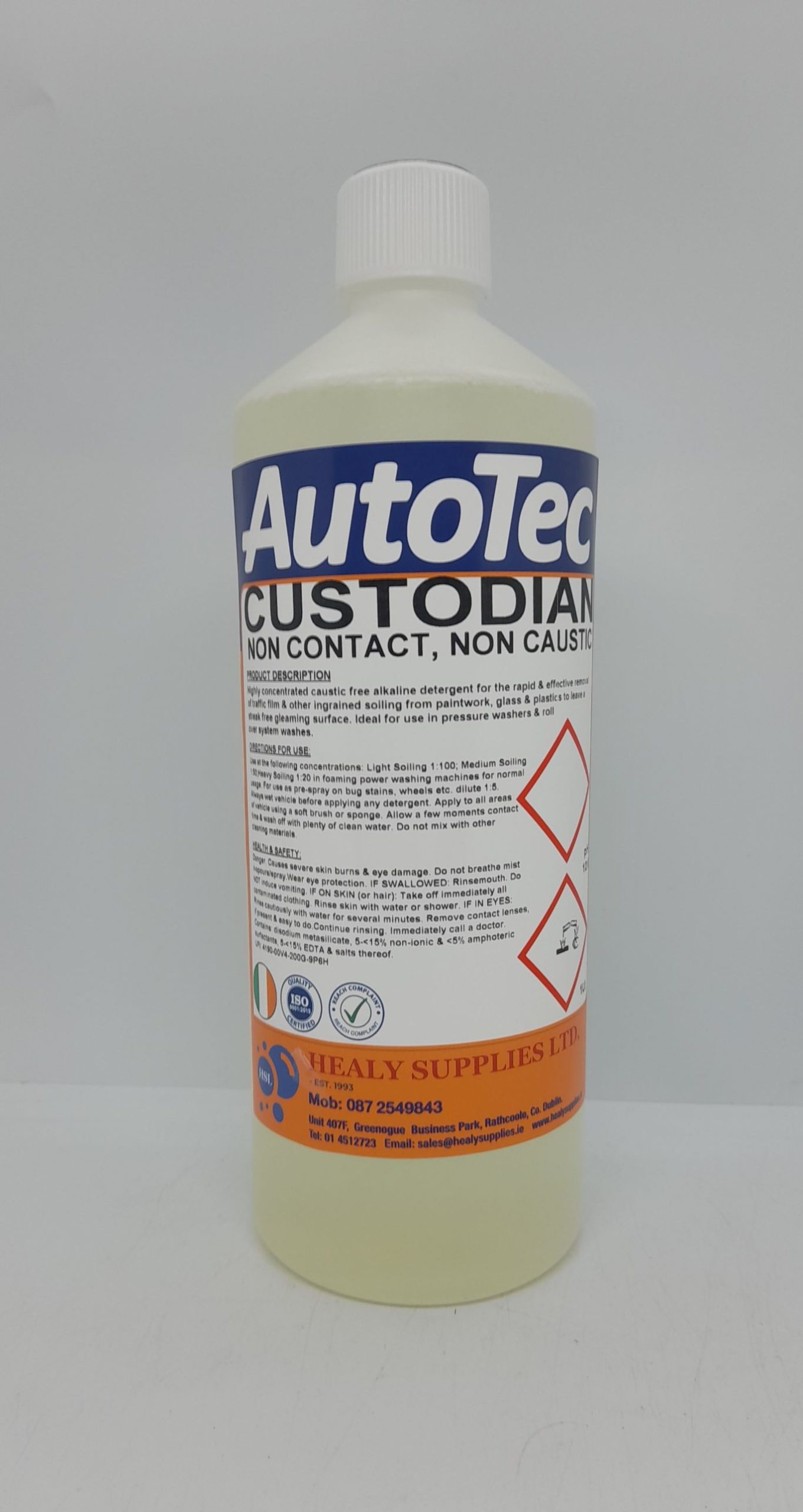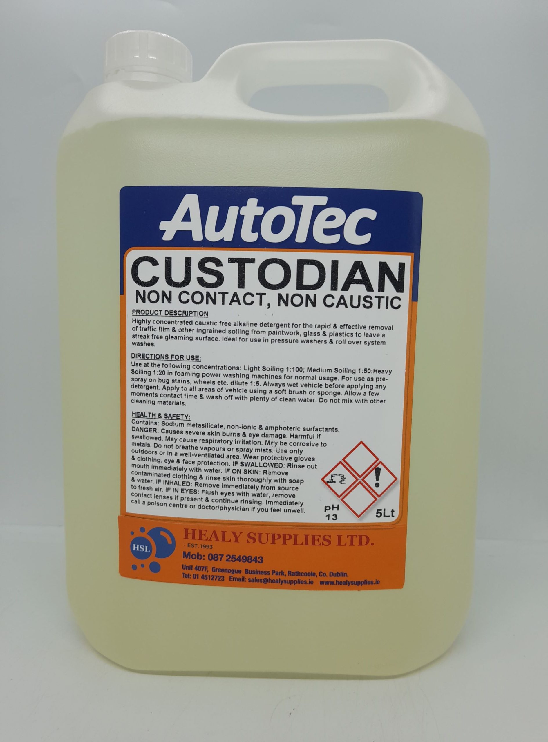 | ADVANTAGES: HIGH FOAM STABILITY: Custodian is formulated to produce medium/high foam when used at the appropriate dilutions. This ensures long contact times to promotes soil removal. HIGH CLEANING POWER: Custodian contains a powerful blend of alkalis, surfactants, sequestering agent and emulsifiers, which remove grease, dirt and traffic film with ease SUITABLE IN HARD OR SOFT WATER: Custodian contains a sequestering agent, which inhibits scale formulation & optimises detergency, even in very hard water areas. VERSATILITY OF USE: Custodian can be used in all pressure washer or brush wash systems. It is also suitable for manual cleaning when desired. BIODEGRADABLE: Fully biodegradable. SOLUBILITY: 100% soluble in water. |
