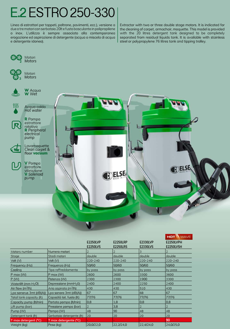 The Elsea Estro 250 Hotwave is a dual vacuum hot water carpet extraction machine giving excellent cleaning capability with short drying times.
