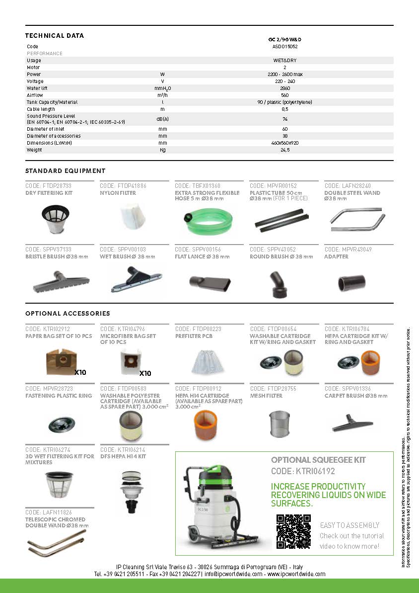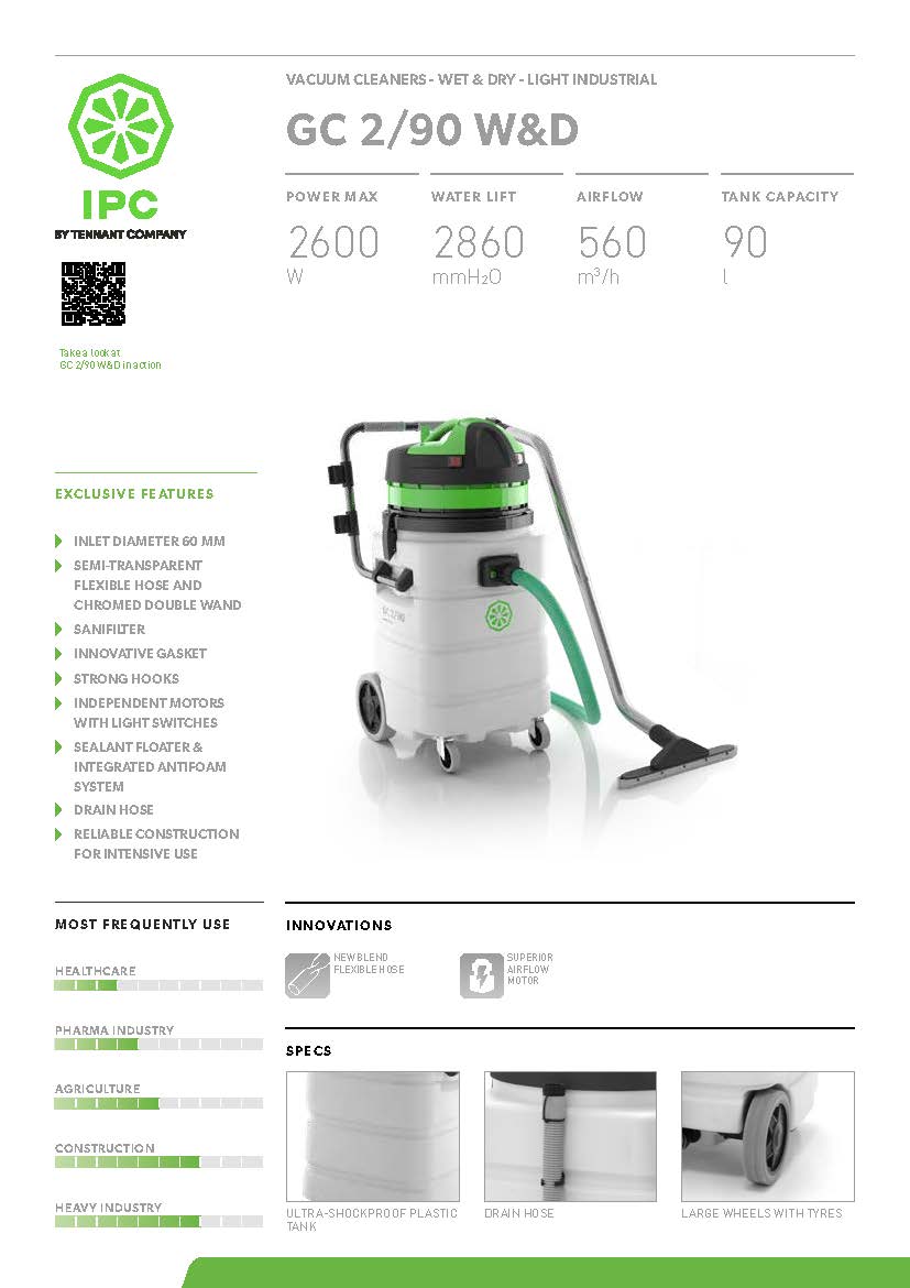 GC 2/90 W&D is a professional wet and dry vacuum. Compact and powerful, it is specifically designed for the cleaning of large industrial areas.Cleaning work is facilitated thanks to a comfortable handle, which allows the movement of the vacuum cleaner. In addition to that, a drain hose enables a rapid emptying of the barrel and the wide wheels guarantee maximum manoeuvrability. The two-stage motor can reach up to 2400 W power. Ideal for the removal of large quantities of liquids in environments such as: car washes, garages, swimming pools, workshops.